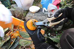 | 採れた柿を手箕(テミ)やバケツで運びます。 | ||